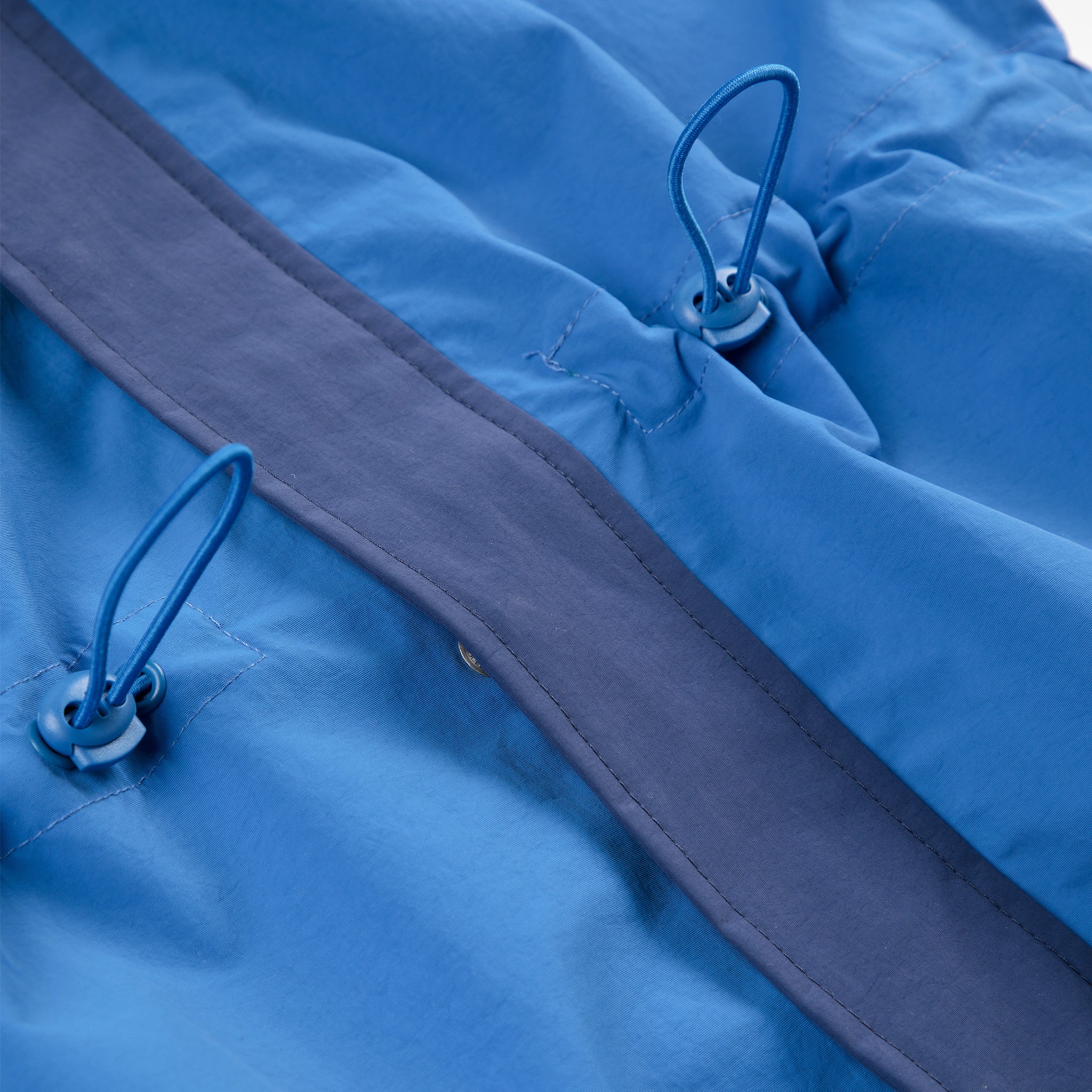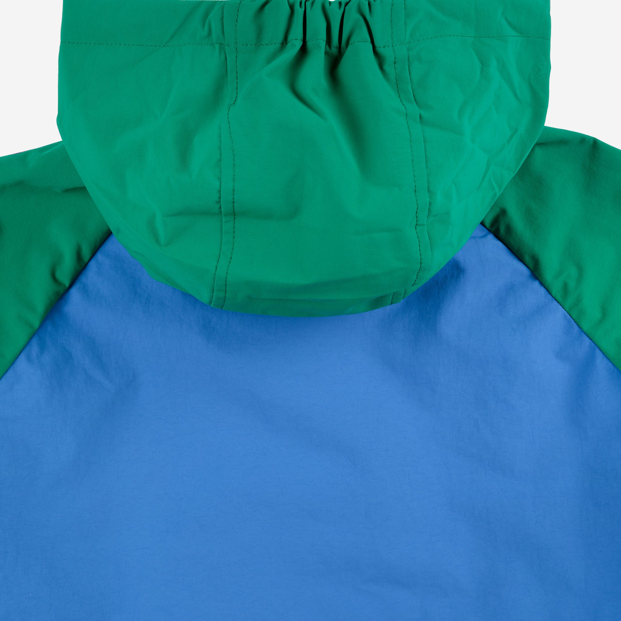 Made from 100% recycled polyamide, it features a hood, long raglan sleeves, adjustable waistband, and front snap fastening.