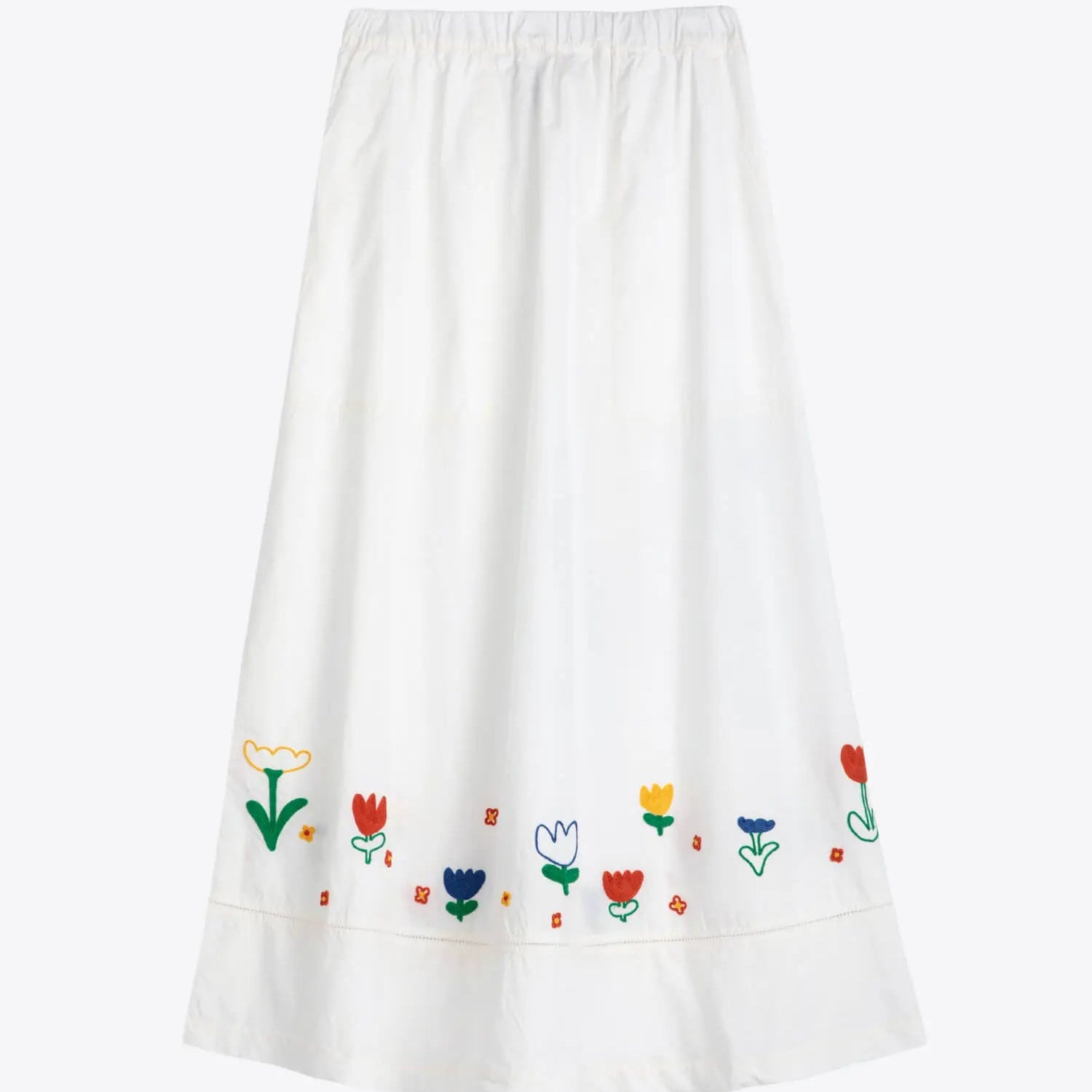 This white midi skirt offers timeless sophistication with its flared silhouette and elasticated waistband for flexibility. Made from 100% organic cotton, its lightweight, non-stretchy fabric provides ease and comfort.