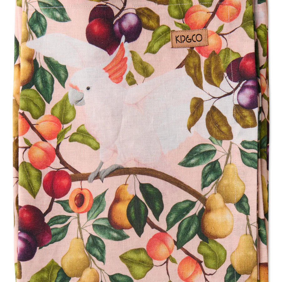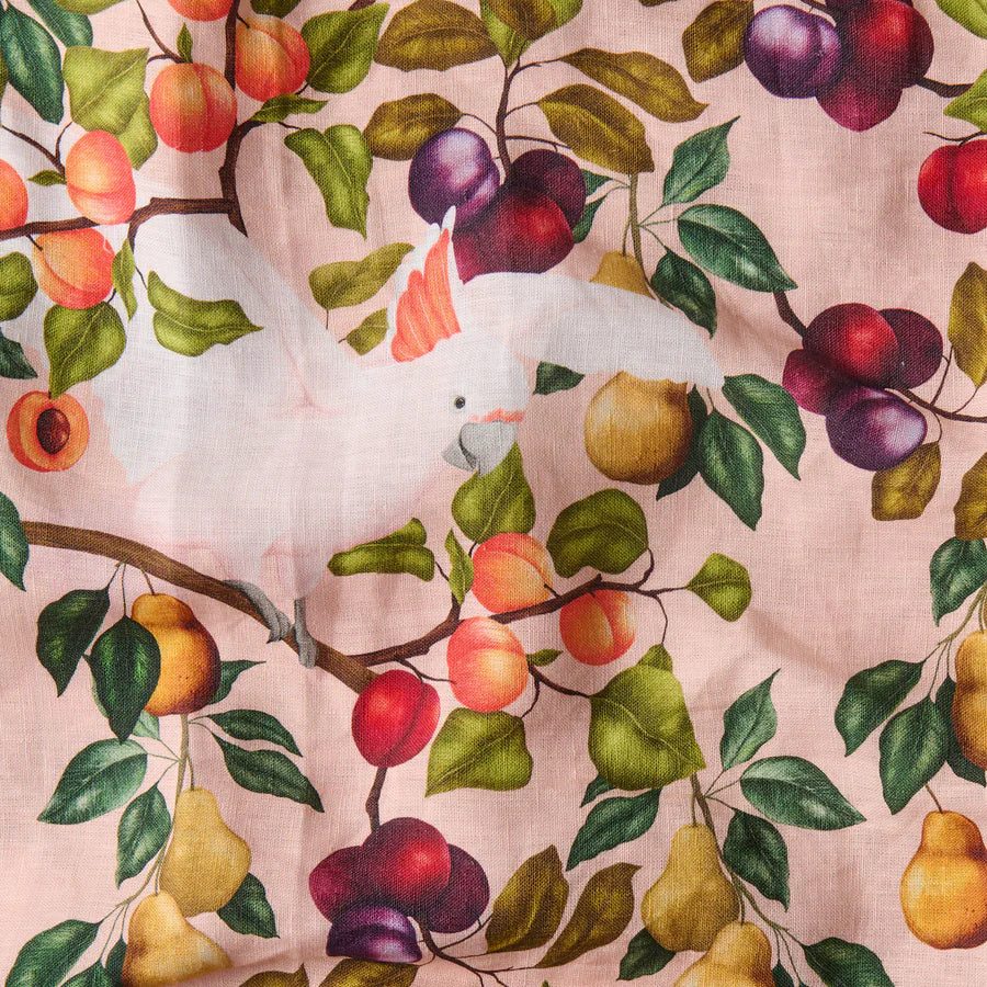 Made from a linen cotton blend, this tablecloth is filled with fresh plums, peaches and pears with stunning Aussie galahs on a peach pink base.